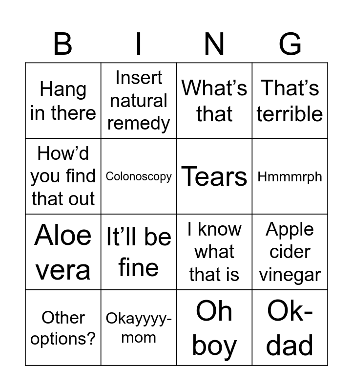 This bingo card has 16 words: Okayyyy- mom, Apple cider vinegar, What’s that, Hang in there, Aloe vera, Insert natural remedy, I know what that is, Oh boy, How’d you find that out, Colonoscopy, Other options?, That’s terrible, It’ll be fine, Hmmmrph, Tears and Ok-dad.