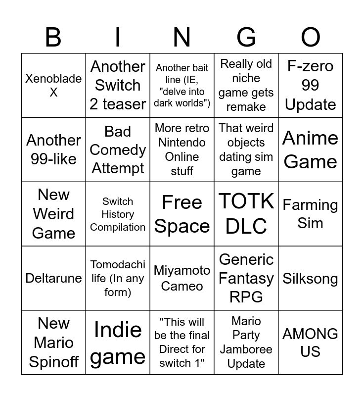 This bingo card has a free space and 24 words: Tomodachi life (In any form), Indie game, More retro Nintendo Online stuff, New Mario Spinoff, F-zero 99 Update, Xenoblade X, Another 99-like, Another Switch 2 teaser, TOTK DLC, Miyamoto Cameo, That weird objects dating sim game, New Weird Game, Generic Fantasy RPG, Silksong, Bad Comedy Attempt, Mario Party Jamboree Update, Farming Sim, Another bait line (IE, "delve into dark worlds"), Anime Game, Switch History Compilation, AMONG US, Deltarune, Really old niche game gets remake and "This will be the final Direct for switch 1".