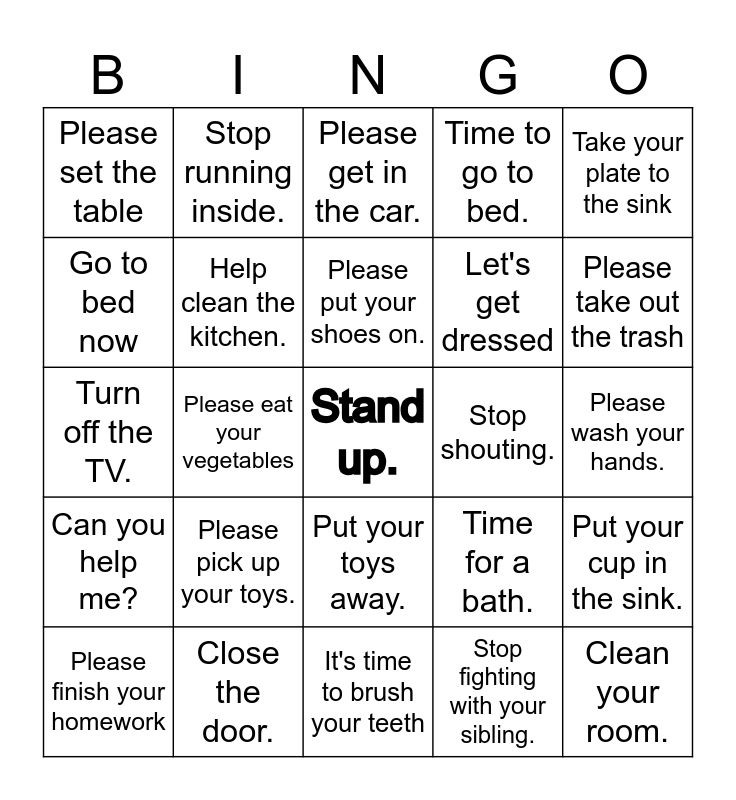This bingo card has 25 words: Please pick up your toys., It's time to brush your teeth, Please put your shoes on., Please finish your homework, Take your plate to the sink, Please set the table, Go to bed now, Stop running inside., Stop shouting., Put your toys away., Let's get dressed, Turn off the TV., Time for a bath., Put your cup in the sink., Help clean the kitchen., Clean your room., Please wash your hands., Please get in the car., Please take out the trash, Please eat your vegetables, Stand up., Close the door., Can you help me?, Time to go to bed. and Stop fighting with your sibling..
