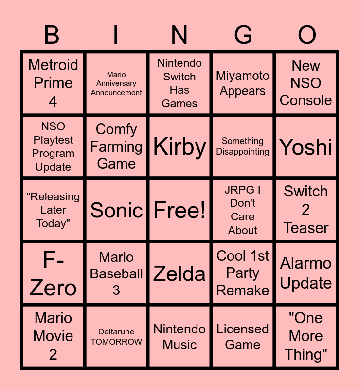 This bingo card has a free space and 24 words: Mario Baseball 3, Deltarune TOMORROW, Kirby, Mario Movie 2, New NSO Console, Metroid Prime 4, NSO Playtest Program Update, Mario Anniversary Announcement, JRPG I Don't Care About, Zelda, Something Disappointing, "Releasing Later Today", Cool 1st Party Remake, Alarmo Update, Comfy Farming Game, Licensed Game, Switch 2 Teaser, Nintendo Switch Has Games, Yoshi, Sonic, "One More Thing", F-Zero, Miyamoto Appears and Nintendo Music.