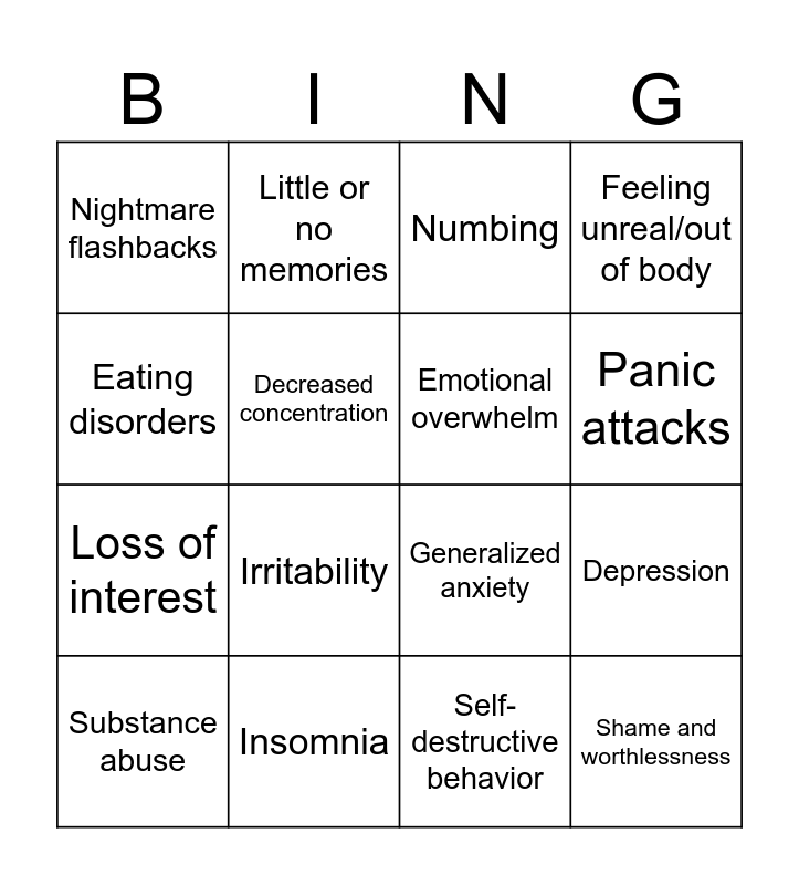 This bingo card has 20 words: Depression, Hypervigilance/mistrust, Numbing, Loss of a sense of the future, Substance abuse, Eating disorders, Insomnia, Nightmare flashbacks, Loss of interest, Little or no memories, Irritability, Generalized anxiety, Decreased concentration, Shame and worthlessness, Emotional overwhelm, Chronic pain/headaches, Panic attacks, Feeling unreal/out of body, Self-destructive behavior and Loss of sense "Who I am".