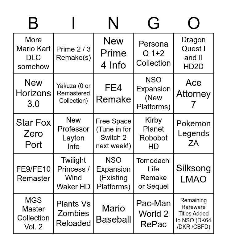 This bingo card has a free space and 24 words: Twilight Princess / Wind Waker HD, Plants Vs Zombies Reloaded, FE4 Remake, MGS Master Collection Vol. 2, Dragon Quest I and II HD2D, More Mario Kart DLC somehow, New Horizons 3.0, Prime 2 / 3 Remake(s), Kirby Planet Robobot HD, NSO Expansion (Existing Platforms), NSO Expansion (New Platforms), Star Fox Zero Port, Tomodachi Life Remake or Sequel, Silksong LMAO, Yakuza (0 or Remastered Collection), Pac-Man World 2 RePac, Pokemon Legends ZA, New Prime 4 Info, Ace Attorney 7, New Professor Layton Info, Remaining Rareware Titles Added to NSO (DK64 /DKR /CBFD), FE9/FE10 Remaster, Persona Q 1+2 Collection and Mario Baseball.