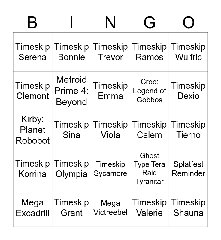 This bingo card has 25 words: Timeskip Olympia, Mega Victreebel, Timeskip Emma, Mega Excadrill, Timeskip Wulfric, Timeskip Serena, Timeskip Clemont, Timeskip Bonnie, Timeskip Calem, Timeskip Sycamore, Croc: Legend of Gobbos, Kirby: Planet Robobot, Ghost Type Tera Raid Tyranitar, Splatfest Reminder, Metroid Prime 4: Beyond, Timeskip Shauna, Timeskip Tierno, Timeskip Trevor, Timeskip Dexio, Timeskip Sina, Timeskip Viola, Timeskip Grant, Timeskip Korrina, Timeskip Ramos and Timeskip Valerie.