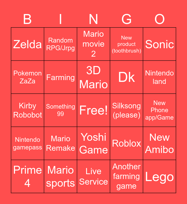 This bingo card has a free space and 24 words: Mario Remake, Mario sports, 3D Mario, Prime 4, Sonic, Zelda, Pokemon ZaZa, Random RPG/Jrpg, Silksong (please), Yoshi Game, Dk, Kirby Robobot, Roblox, New Amibo, Farming, Another farming game, New Phone app/Game, Mario movie 2, Nintendo land, Something 99, Lego, Nintendo gamepass, New product (toothbrush) and Live Service.