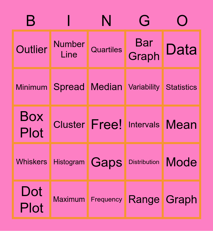 This bingo card has a free space and 24 words: Dot Plot, Histogram, Median, Range, Data, Outlier, Number Line, Quartiles, Intervals, Mean, Box Plot, Spread, Distribution, Mode, Minimum, Maximum, Frequency, Bar Graph, Statistics, Whiskers, Cluster, Gaps, Variability and Graph.