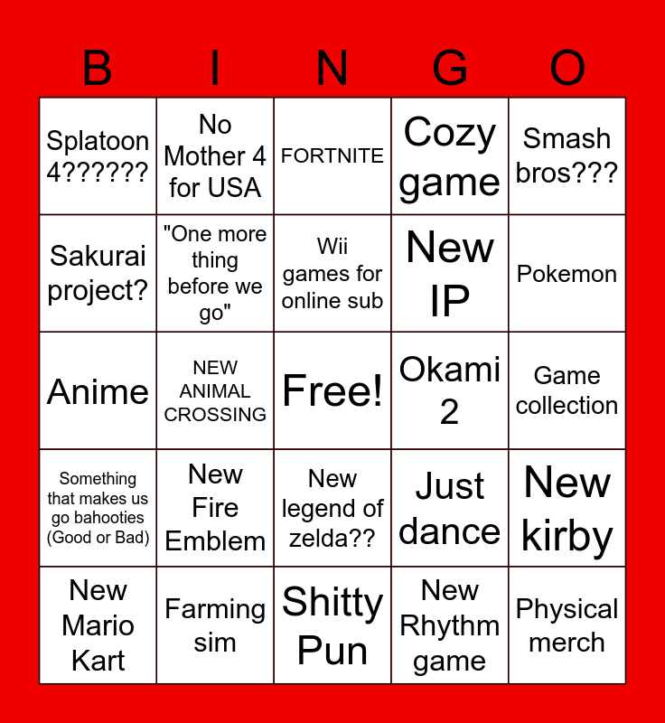 This bingo card has a free space and 24 words: New Fire Emblem, Farming sim, Wii games for online sub, New Mario Kart, Smash bros???, Splatoon 4??????, Sakurai project?, No Mother 4 for USA, Okami 2, New legend of zelda??, New IP, Anime, Just dance, New kirby, "One more thing before we go", New Rhythm game, Game collection, FORTNITE, Pokemon, NEW ANIMAL CROSSING, Physical merch, Something that makes us go bahooties (Good or Bad), Cozy game and Shitty Pun.