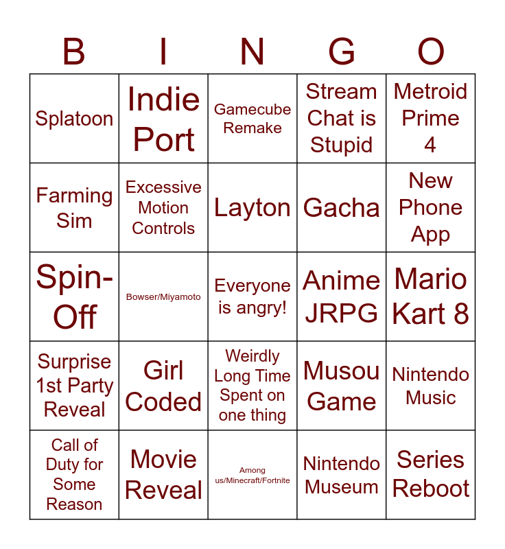 This bingo card has a free space and 24 words: Girl Coded, Movie Reveal, Layton, Call of Duty for Some Reason, Metroid Prime 4, Splatoon, Farming Sim, Indie Port, Anime JRPG, Weirdly Long Time Spent on one thing, Gacha, Spin-Off, Musou Game, Nintendo Music, Excessive Motion Controls, Nintendo Museum, Mario Kart 8, Gamecube Remake, New Phone App, Bowser/Miyamoto, Series Reboot, Surprise 1st Party Reveal, Stream Chat is Stupid and Among us/Minecraft/Fortnite.