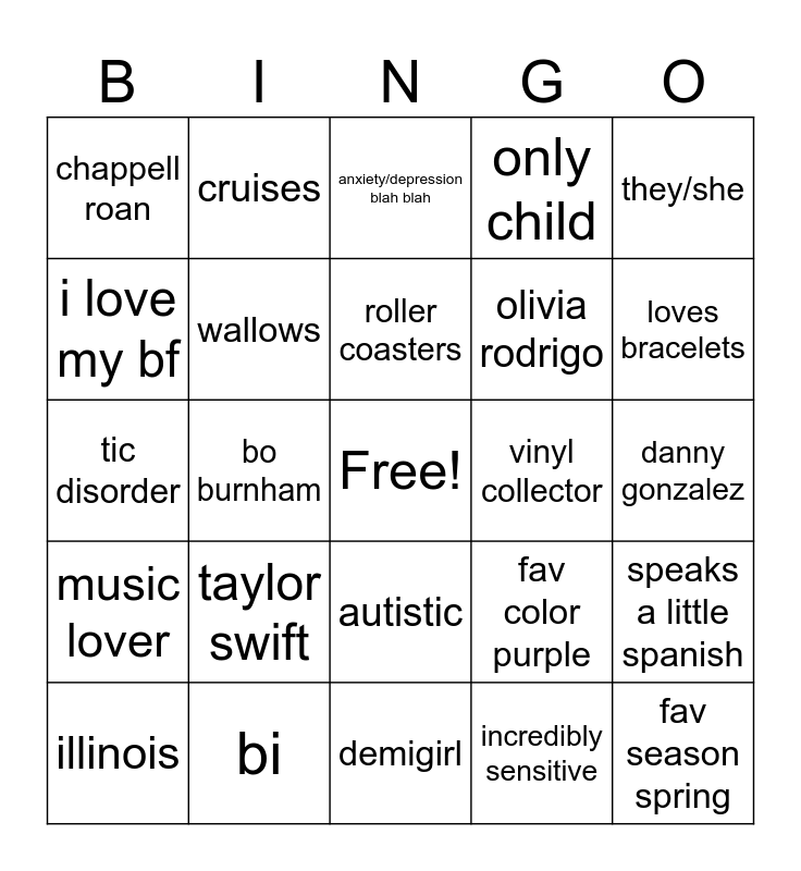 This bingo card has a free space and 24 words: taylor swift, bi, roller coasters, illinois, they/she, chappell roan, i love my bf, cruises, vinyl collector, autistic, olivia rodrigo, tic disorder, fav color purple, speaks a little spanish, wallows, incredibly sensitive, danny gonzalez, anxiety/depression blah blah, loves bracelets, bo burnham, fav season spring, music lover, only child and demigirl.