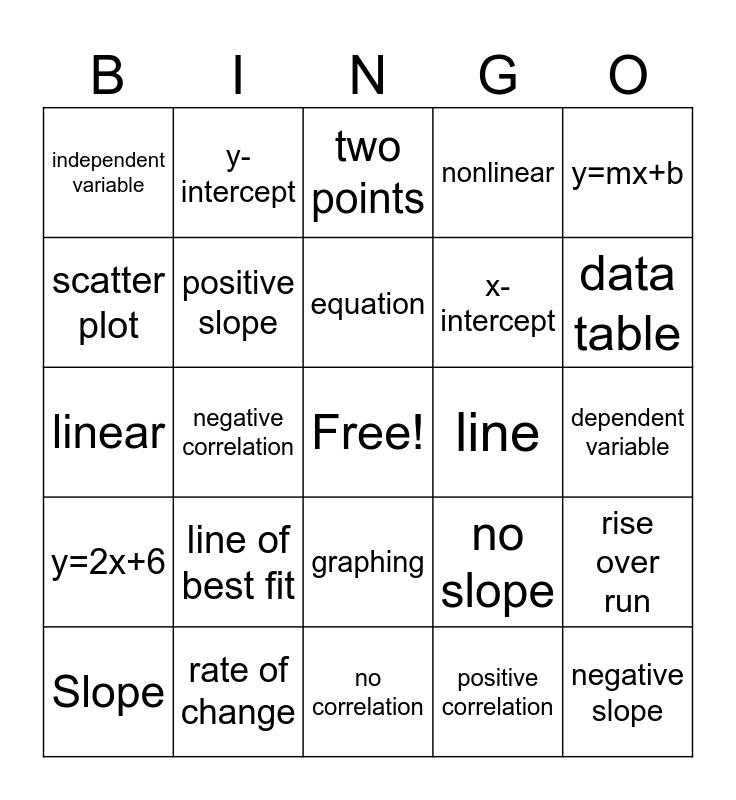 This bingo card has a free space and 24 words: Slope, line of best fit, equation, positive correlation, y=mx+b, independent variable, y-intercept, two points, line, dependent variable, linear, positive slope, no slope, rise over run, scatter plot, rate of change, no correlation, nonlinear, data table, y=2x+6, negative correlation, graphing, x-intercept and negative slope.