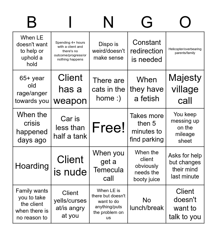 This bingo card has a free space and 24 words: Client is nude, Client yells/curses at/is angry at you, There are cats in the home :), Family wants you to take the client when there is no reason to, Helicopter/overbearing parents/family, When LE doesn't want to help or uphold a hold, 65+ year old rage/anger towards you, Spending 4+ hours with a client and there's no outcome/progress/or nothing happens, Takes more then 5 minutes to find parking, When you get a Temecula call, When they have a fetish, When the crisis happened days ago, When the client obviously needs the booty juice, Asks for help but changes their mind last minute, Client has a weapon, No lunch/break, You keep messing up on the mileage sheet, Dispo is weird/doesn't make sense, Majesty village call, Car is less than half a tank, Client doesn't want to talk to you, Hoarding, Constant redirection is needed and When LE is there but doesn't want to do anything/puts the problem on us.