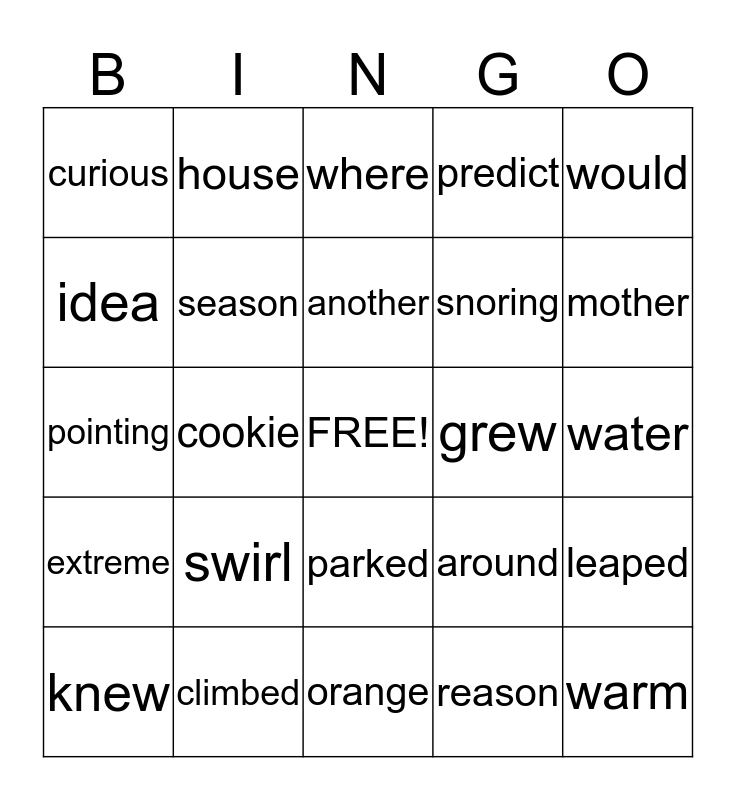 This bingo card has a free space and 24 words: swirl, climbed, another, knew, would, curious, idea, house, grew, parked, snoring, pointing, around, leaped, season, reason, water, where, mother, cookie, warm, extreme, predict and orange.