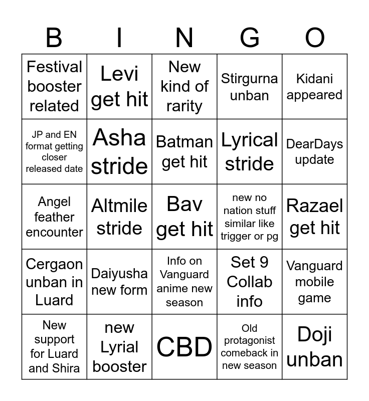 This bingo card has a free space and 24 words: Daiyusha new form, new Lyrial booster, Batman get hit, New support for Luard and Shira, Kidani appeared, Festival booster related, JP and EN format getting closer released date, Levi get hit, new no nation stuff similar like trigger or pg, Info on Vanguard anime new season, Lyrical stride, Angel feather encounter, Set 9 Collab info, Vanguard mobile game, Asha stride, Old protagonist comeback in new season, Razael get hit, New kind of rarity, DearDays update, Altmile stride, Doji unban, Cergaon unban in Luard, Stirgurna unban and CBD.