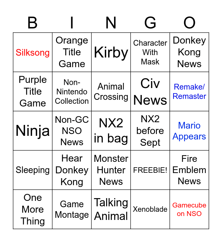 This bingo card has 25 words: Hear Donkey Kong, Talking Animal, Animal Crossing, One More Thing, Donkey Kong News, Silksong, Purple Title Game, Orange Title Game, NX2 before Sept, Monster Hunter News, Civ News, Ninja, FREEBIE!, Fire Emblem News, Non-Nintendo Collection, Gamecube on NSO, Mario Appears, Kirby, Remake/ Remaster, Non-GC NSO News, NX2 in bag, Game Montage, Sleeping, Character With Mask and Xenoblade.