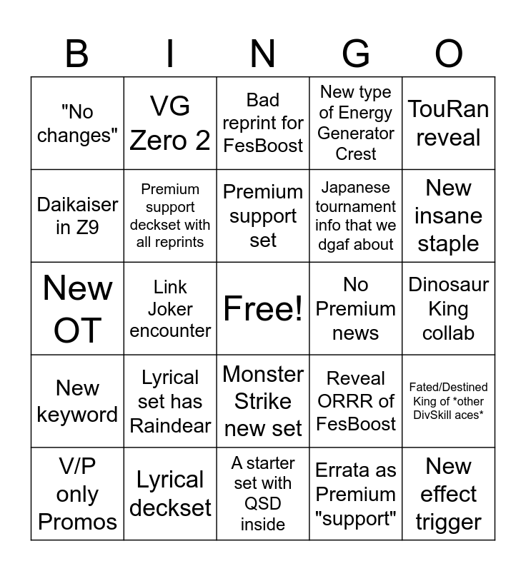 This bingo card has a free space and 24 words: Lyrical set has Raindear, Lyrical deckset, Premium support set, V/P only Promos, TouRan reveal, "No changes", Daikaiser in Z9, VG Zero 2, No Premium news, Monster Strike new set, Japanese tournament info that we dgaf about, New OT, Reveal ORRR of FesBoost, Fated/Destined King of *other DivSkill aces*, Premium support deckset with all reprints, Errata as Premium "support", Dinosaur King collab, Bad reprint for FesBoost, New insane staple, Link Joker encounter, New effect trigger, New keyword, New type of Energy Generator Crest and A starter set with QSD inside.