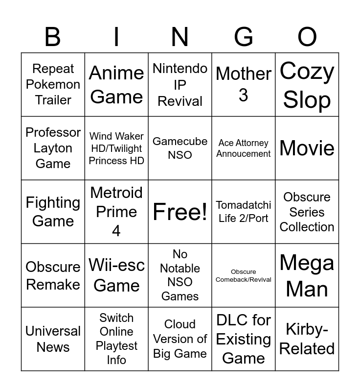 This bingo card has a free space and 39 words: Deltarune Tomorrow, Hollow Knight Silksong, 3D Mario, Wind Waker HD/Twilight Princess HD, Universal News, No Notable NSO Games, Gamecube NSO, RPG Slop, Cozy Slop, Obscure Remake, Metroid Prime 4, Mother 3, Kirby-Related, Obscure Series Collection, Tomadatchi Life 2/Port, Wii-esc Game, Nothing Burger, Repeat Pokemon Trailer, Sonic Annoucement, Obscure Comeback/Revival, Professor Layton Game, Cloud Version of Big Game, Ace Attorney Annoucement, Movie, Kid Icarus, Rhythm Heaven, Amiibo, Alarmo Mentioned, Nintendo Music Mentioned, Anime Game, Fire Emblem, Star Fox, Nintendo IP Revival, Switch Online Playtest Info, DLC for Existing Game, Nintendo SF Store, Mega Man, Fighting Game and F-Zero.