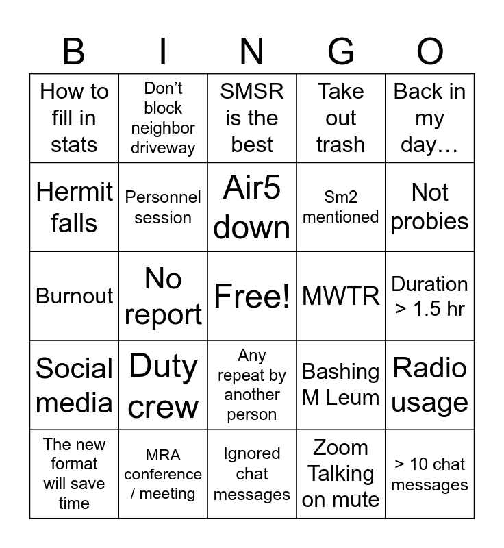 This bingo card has a free space and 29 words: The new format will save time, Jon story time, No report, Committee report without agenda, How to fill in stats, SMSR is the best, Personnel session, Duty crew, MWTR, MRA conference / meeting, Duration > 1.5 hr, > 10 chat messages, Ignored chat messages, Zoom Talking on mute, Not probies, Any repeat by same person, Any repeat by another person, Social media, Back in my day…, Burnout, Bashing M Leum, Buried with work did not do stuff, Sm2 mentioned, Hermit falls, Take out trash, Don’t block neighbor driveway, Radio usage, Air5 down and Cops prejudging.