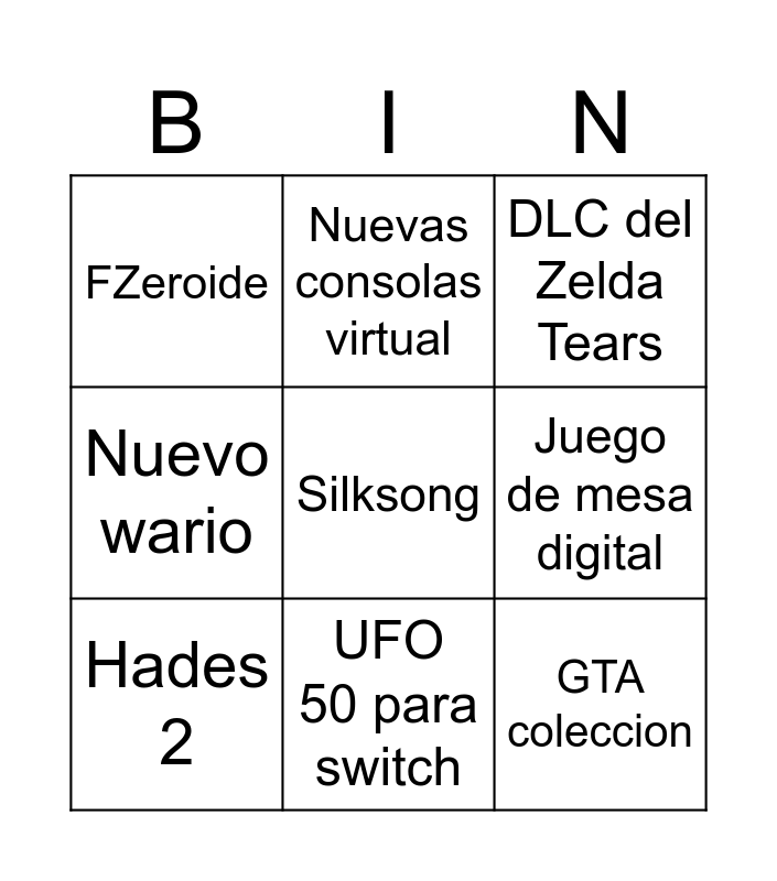 This bingo card has a free space and 8 words: Juego de mesa digital, DLC del Zelda Tears, Nuevas consolas virtual, Hades 2, FZeroide, GTA coleccion, Nuevo wario and UFO 50 para switch.