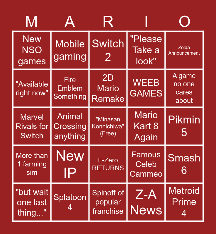 This bingo card has a free space and 24 words: "but wait one last thing...", New IP, 2D Mario Remake, Z-A News, Zelda Announcement, New NSO games, Mobile gaming, Switch 2, Mario Kart 8 Again, Pikmin 5, Marvel Rivals for Switch, Fire Emblem Something, Famous Celeb Cammeo, Smash 6, "Available right now", Splatoon 4, Spinoff of popular franchise, "Please Take a look", A game no one cares about, More than 1 farming sim, Animal Crossing anything, F-Zero RETURNS, WEEB GAMES and Metroid Prime 4.