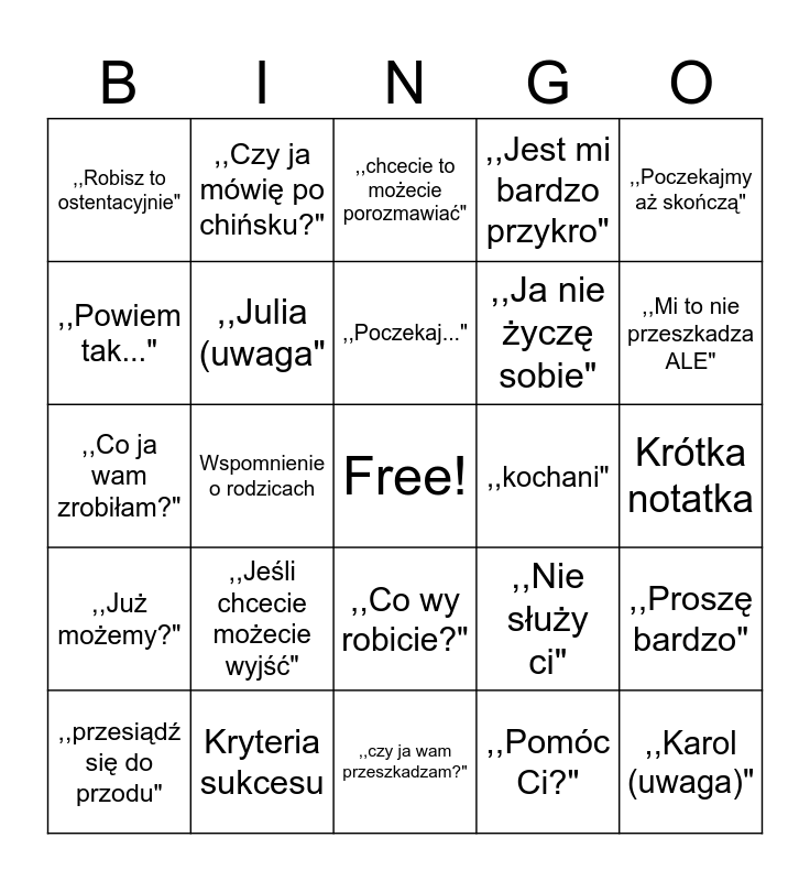 This bingo card has a free space and 24 words: ,,Jeśli chcecie możecie wyjść", Kryteria sukcesu, ,,Poczekaj...", ,,przesiądź się do przodu", ,,Poczekajmy aż skończą", ,,Robisz to ostentacyjnie", ,,Powiem tak...", ,,Czy ja mówię po chińsku?", ,,kochani", ,,Co wy robicie?", ,,Ja nie życzę sobie", ,,Co ja wam zrobiłam?", ,,Nie służy ci", ,,Proszę bardzo", ,,Julia (uwaga", ,,Pomóc Ci?", Krótka notatka, ,,chcecie to możecie porozmawiać", ,,Mi to nie przeszkadza ALE", Wspomnienie o rodzicach, ,,Karol (uwaga)", ,,Już możemy?", ,,Jest mi bardzo przykro" and ,,czy ja wam przeszkadzam?".