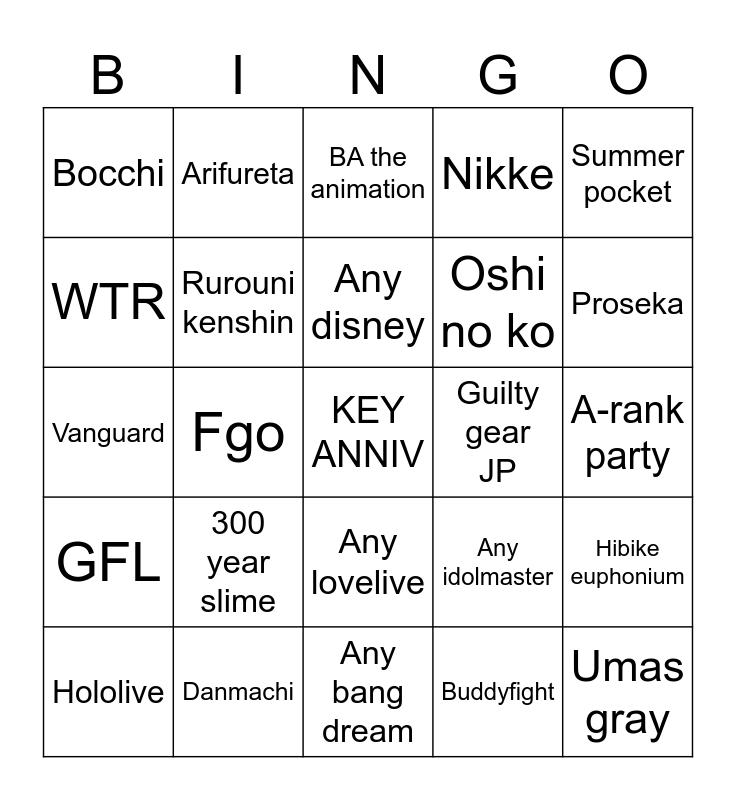 This bingo card has a free space and 24 words: 300 year slime, Danmachi, Any disney, Hololive, Summer pocket, Bocchi, WTR, Arifureta, Guilty gear JP, Any lovelive, Oshi no ko, Vanguard, Any idolmaster, Hibike euphonium, Rurouni kenshin, Buddyfight, A-rank party, BA the animation, Proseka, Fgo, Umas gray, GFL, Nikke and Any bang dream.