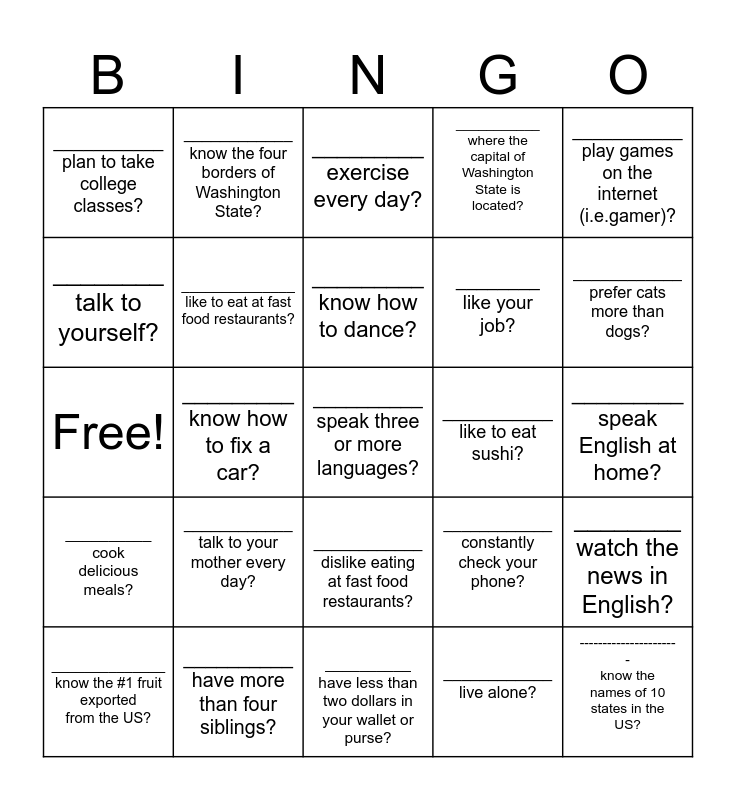 This bingo card has 25 words: ____________ talk to your mother every day?, __________ have less than two dollars in your wallet or purse?, _________ know how to dance?, ______________ know the #1 fruit exported from the US?, ___________ play games on the internet (i.e.gamer)?, ___________ plan to take college classes?, ________ talk to yourself?, ____________ know the four borders of Washington State?, ___________ like to eat sushi?, ____________ dislike eating at fast food restaurants?, ________ like your job?, Free!, ____________ constantly check your phone?, ________ watch the news in English?, ______________ like to eat at fast food restaurants?, ---------------------- know the names of 10 states in the US?, _________ speak English at home?, _________ exercise every day?, ____________ prefer cats more than dogs?, _________ know how to fix a car?, __________ speak three or more languages?, __________ have more than four siblings?, __________ cook delicious meals?, ___________ where the capital of Washington State is located? and ____________ live alone?.