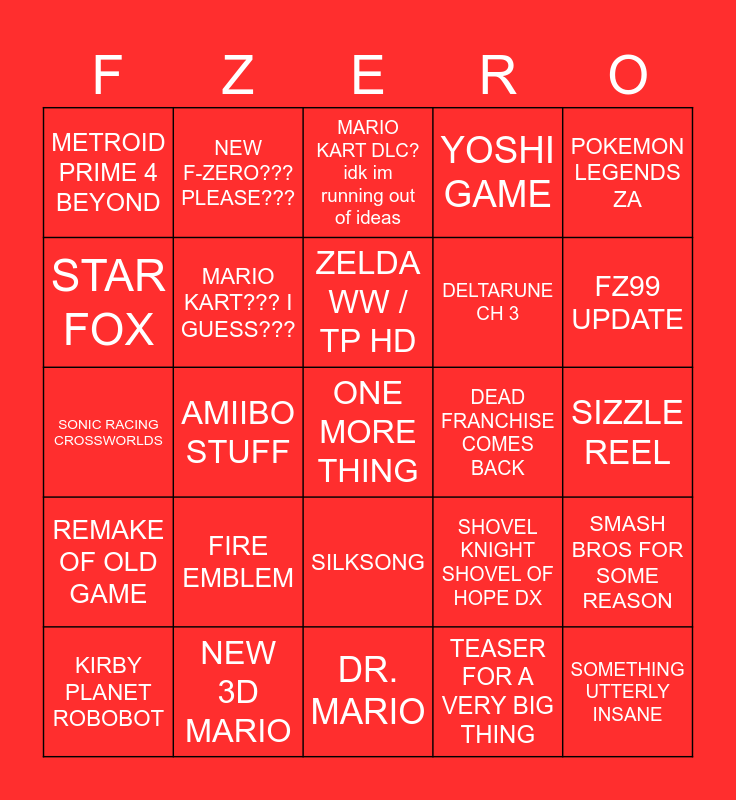 This bingo card has a free space and 24 words: FIRE EMBLEM, NEW 3D MARIO, ZELDA WW / TP HD, KIRBY PLANET ROBOBOT, POKEMON LEGENDS ZA, METROID PRIME 4 BEYOND, STAR FOX, NEW F-ZERO??? PLEASE???, DEAD FRANCHISE COMES BACK, SILKSONG, DELTARUNE CH 3, SONIC RACING CROSSWORLDS, SHOVEL KNIGHT SHOVEL OF HOPE DX, SMASH BROS FOR SOME REASON, MARIO KART??? I GUESS???, TEASER FOR A VERY BIG THING, SIZZLE REEL, MARIO KART DLC? idk im running out of ideas, FZ99 UPDATE, AMIIBO STUFF, SOMETHING UTTERLY INSANE, REMAKE OF OLD GAME, YOSHI GAME and DR. MARIO.