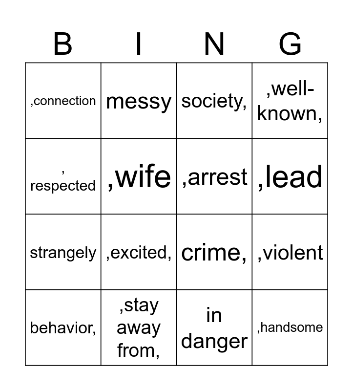 This bingo card has 39 words: Free!, According to, ,identity, ,arrest, ,ordinary, ,become, ,lead, ,mysterious, , respected, ,handsome, ,violent, ,well-known,, behavior,, in danger, ,stay away from,, wake-up, ,come out, ,connection, ,commit, ,evil, ,wife, ,unusual,, strangely, ,excited,, cause,, behave,, dream,, take control, ,hairy,, messy, ,case,, suspect,, society,, develop, ,protect, ,appearence,, personality,, crime, and disappear.