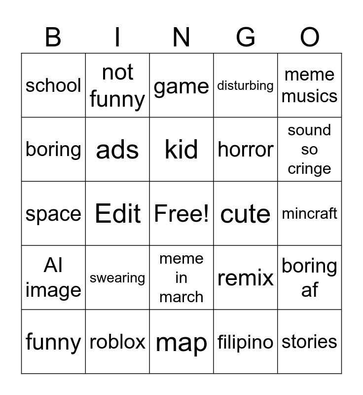 This bingo card has a free space and 29 words: funny, ishowspeed, Edit, phonk, school, game, ads, swearing, cute, roblox, mincraft, stories, map, filipino, sound so cringe, fake stories, meme in march, AI image, meme musics, space, remix, philly/jersey club/tang/toprock, horror, boring, disturbing, not funny, boring af, kid and fortnite.