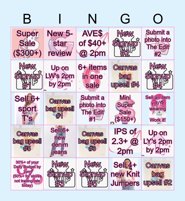 This bingo card has 24 images, a free space and 24 words: 30%+ of your Daily Budget by 2pm (50%+ for stores not trading late today), Sell 6+ new denim jeans, 6+ items in one sale, Sell 4+ new Knit Jumpers, Submit a photo into The Edit #2, Super Sale ($300+), New 5-star review, AVE$ of $40+ @ 2pm, Mini Super Sale ($150+), Sell an item you're wearing Work it!, Sell 6+ sport T's, Up on LW's 2pm by 2pm, IPS of 2.3+ @ 2pm, Up on LY's 2pm by 2pm, New Signup #1, New Signup #3, New Signup #5, New Signup #2, New Signup #4, Canvas bag upsell #5, Canvas bag upsell #1, Canvas bag upsell #3, Canvas bag upsell #4 and Canvas bag upsell #2.