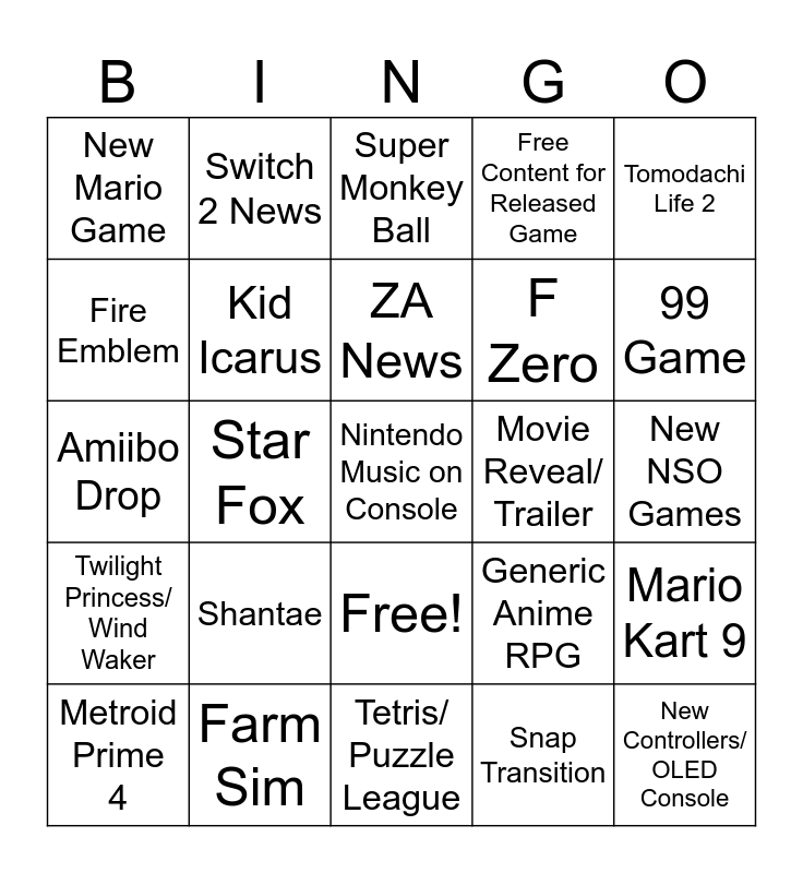 This bingo card has 26 words: Free!, Snap Transition, ZA News, Farm Sim, Tomodachi Life 2, New Mario Game, Fire Emblem, Switch 2 News, New NSO Games, Generic Anime RPG, F Zero, Amiibo Drop, Mario Kart 9, Metroid Prime 4, Star Fox, Wii Game Remaster, Free Content for Released Game, Twilight Princess/ Wind Waker, Super Monkey Ball, Nintendo Music on Console, 99 Game, Tetris/ Puzzle League, Movie Reveal/ Trailer, Shantae, Kid Icarus and New Controllers/ OLED Console.