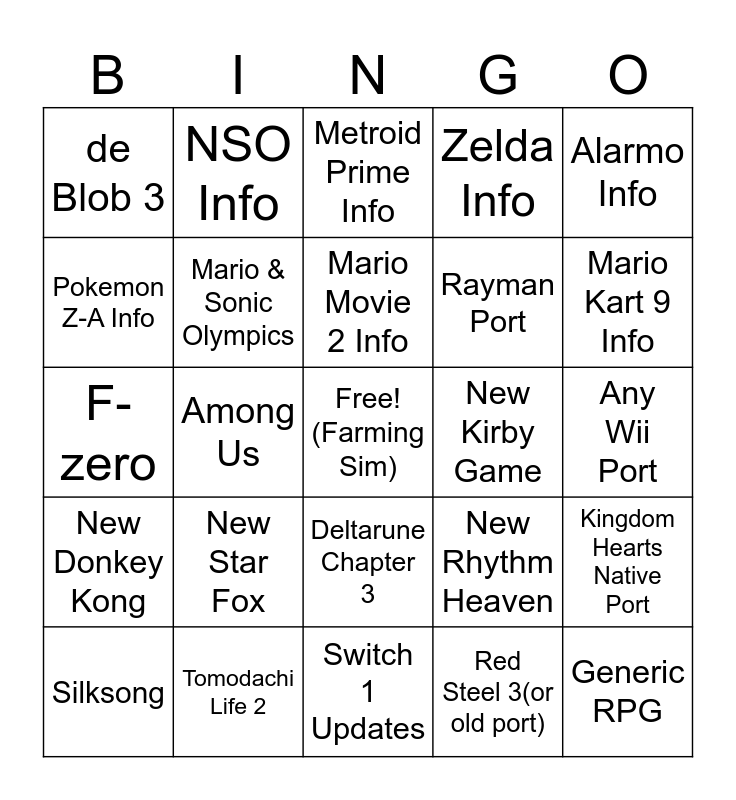 This bingo card has a free space and 24 words: New Star Fox, Tomodachi Life 2, Mario Movie 2 Info, Silksong, Alarmo Info, de Blob 3, Pokemon Z-A Info, NSO Info, New Kirby Game, Deltarune Chapter 3, Rayman Port, F-zero, New Rhythm Heaven, Kingdom Hearts Native Port, Mario & Sonic Olympics, Red Steel 3(or old port), Any Wii Port, Metroid Prime Info, Mario Kart 9 Info, Among Us, Generic RPG, New Donkey Kong, Zelda Info and Switch 1 Updates.