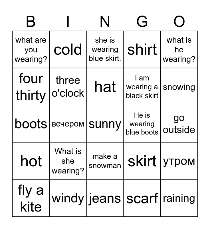 This bingo card has a free space and 24 words: fly a kite, What is she wearing?, hat, scarf, what is he wearing?, what are you wearing?, cold, she is wearing blue skirt., He is wearing blue boots, go outside, boots, three o'clock, skirt, утром, four thirty, windy, jeans, shirt, snowing, hot, вечером, make a snowman, I am wearing a black skirt and raining.