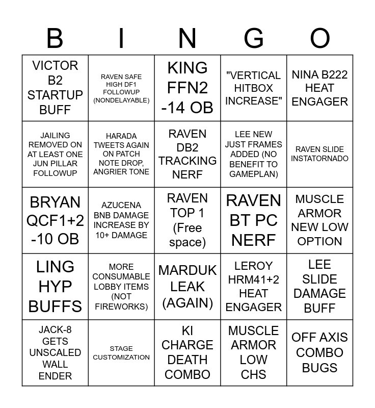 This bingo card has a free space and 24 words: MORE CONSUMABLE LOBBY ITEMS (NOT FIREWORKS), STAGE CUSTOMIZATION, RAVEN DB2 TRACKING NERF, JACK-8 GETS UNSCALED WALL ENDER, NINA B222 HEAT ENGAGER, VICTOR B2 STARTUP BUFF, JAILING REMOVED ON AT LEAST ONE JUN PILLAR FOLLOWUP, RAVEN SAFE HIGH DF1 FOLLOWUP (NONDELAYABLE), RAVEN BT PC NERF, MARDUK LEAK (AGAIN), LEE NEW JUST FRAMES ADDED (NO BENEFIT TO GAMEPLAN), BRYAN QCF1+2 -10 OB, LEROY HRM41+2 HEAT ENGAGER, LEE SLIDE DAMAGE BUFF, HARADA TWEETS AGAIN ON PATCH NOTE DROP, ANGRIER TONE, MUSCLE ARMOR LOW CHS, MUSCLE ARMOR NEW LOW OPTION, KING FFN2 -14 OB, RAVEN SLIDE INSTATORNADO, AZUCENA BNB DAMAGE INCREASE BY 10+ DAMAGE, OFF AXIS COMBO BUGS, LING HYP BUFFS, "VERTICAL HITBOX INCREASE" and KI CHARGE DEATH COMBO.