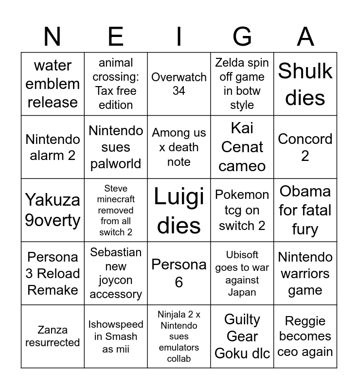 This bingo card has a free space and 24 words: Sebastian new joycon accessory, Ishowspeed in Smash as mii, Among us x death note, Zanza resurrected, Shulk dies, water emblem release, Nintendo alarm 2, animal crossing: Tax free edition, Pokemon tcg on switch 2, Persona 6, Kai Cenat cameo, Yakuza 9overty, Ubisoft goes to war against Japan, Nintendo warriors game, Nintendo sues palworld, Guilty Gear Goku dlc, Obama for fatal fury, Overwatch 34, Concord 2, Steve minecraft removed from all switch 2, Reggie becomes ceo again, Persona 3 Reload Remake, Zelda spin off game in botw style and Ninjala 2 x Nintendo sues emulators collab.
