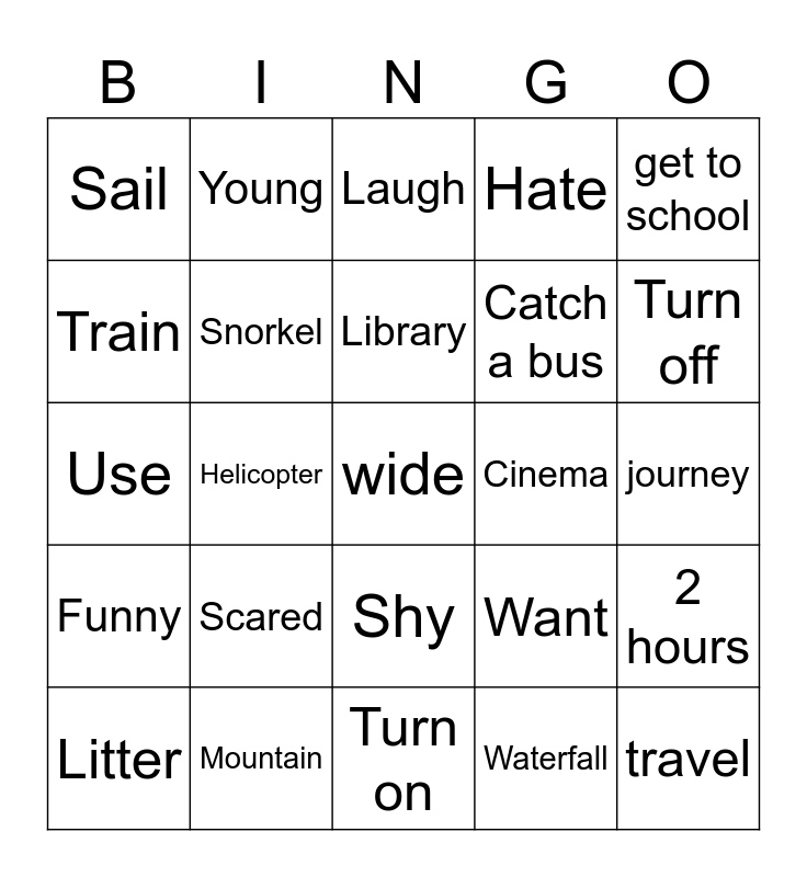 This bingo card has a free space and 29 words: The USA, Mountain, Laugh, Lizard, get to school, Sail, Snorkel, Library, Cinema, 2 hours, Litter, Helicopter, Waterfall, travel, Use, Play the guitar, Turn on, Want, Turn off, Funny, Scared, Have a shower, Catch a bus, journey, Train, Young, Shy, Hate and Want.