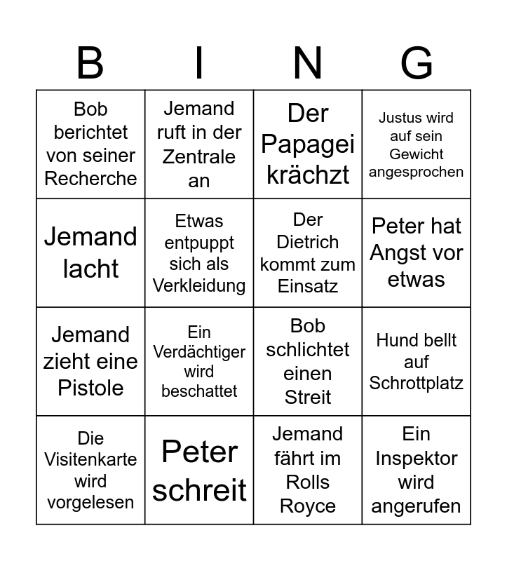 This bingo card has 20 words: Hund bellt auf Schrottplatz, Justus löst den Fall, Der Papagei krächzt, Techno Zwischen-musik, Die Visitenkarte wird vorgelesen, Jemand lacht, Peter schreit, Bob berichtet von seiner Recherche, Jemand zieht eine Pistole, Jemand ruft in der Zentrale an, Ein Verdächtiger wird beschattet, Bob schlichtet einen Streit, Etwas entpuppt sich als Verkleidung, Ein Inspektor wird angerufen, Der Dietrich kommt zum Einsatz, Tante Mathilda braucht Hilfe, Peter hat Angst vor etwas, Justus wird auf sein Gewicht angesprochen, Jemand fährt im Rolls Royce and Der Verstärker wird eingeschaltet.