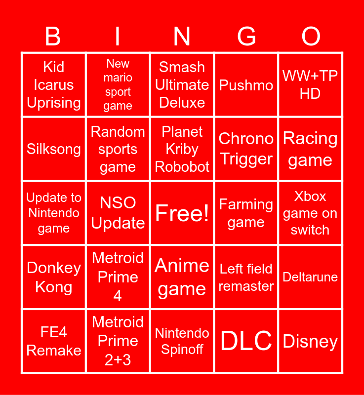 This bingo card has a free space and 24 words: Metroid Prime 4, Metroid Prime 2+3, Planet Kriby Robobot, FE4 Remake, WW+TP HD, Kid Icarus Uprising, Silksong, New mario sport game, Farming game, Anime game, Chrono Trigger, Update to Nintendo game, Left field remaster, Deltarune, Random sports game, DLC, Xbox game on switch, Smash Ultimate Deluxe, Racing game, NSO Update, Disney, Donkey Kong, Pushmo and Nintendo Spinoff.