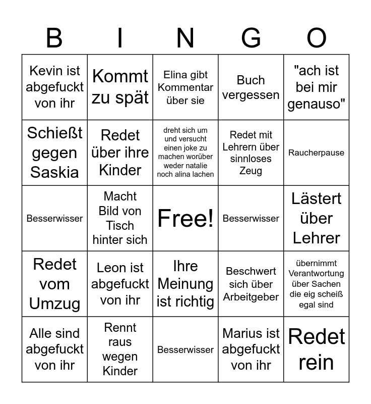 This bingo card has a free space and 24 words: Leon ist abgefuckt von ihr, Rennt raus wegen Kinder, dreht sich um und versucht einen joke zu machen worüber weder natalie noch alina lachen, Alle sind abgefuckt von ihr, "ach ist bei mir genauso", Kevin ist abgefuckt von ihr, Schießt gegen Saskia, Kommt zu spät, Besserwisser, Ihre Meinung ist richtig, Redet mit Lehrern über sinnloses Zeug, Besserwisser, Beschwert sich über Arbeitgeber, übernimmt Verantwortung über Sachen die eig scheiß egal sind, Redet über ihre Kinder, Marius ist abgefuckt von ihr, Lästert über Lehrer, Elina gibt Kommentar über sie, Raucherpause, Macht Bild von Tisch hinter sich, Redet rein, Redet vom Umzug, Buch vergessen and Besserwisser.