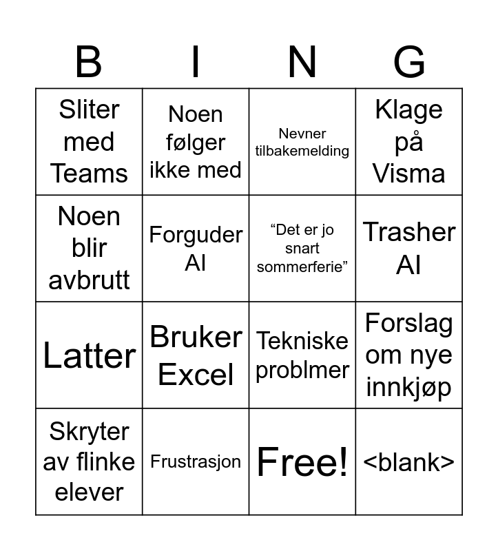 This bingo card has 17 words: Free!, Skryter av flinke elever, Nevner tilbakemelding, Sliter med Teams, Bruker Excel, Klage på Visma, Forslag om nye innkjøp, “Det er jo snart sommerferie”, Trasher AI, Forguder AI, Frustrasjon, Tekniske problmer, Noen blir avbrutt, Noen følger ikke med, Latter, Alt var bedre før and <blank>.