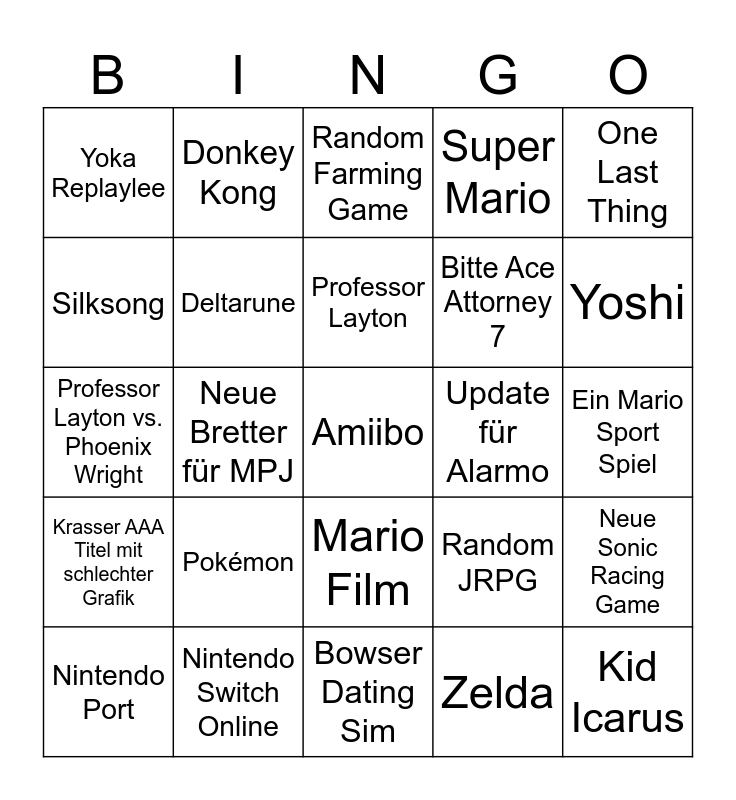 This bingo card has a free space and 24 words: Pokémon, Nintendo Switch Online, Professor Layton, Nintendo Port, One Last Thing, Yoka Replaylee, Silksong, Donkey Kong, Update für Alarmo, Mario Film, Bitte Ace Attorney 7, Professor Layton vs. Phoenix Wright, Random JRPG, Neue Sonic Racing Game, Deltarune, Zelda, Ein Mario Sport Spiel, Random Farming Game, Yoshi, Neue Bretter für MPJ, Kid Icarus, Krasser AAA Titel mit schlechter Grafik, Super Mario and Bowser Dating Sim.