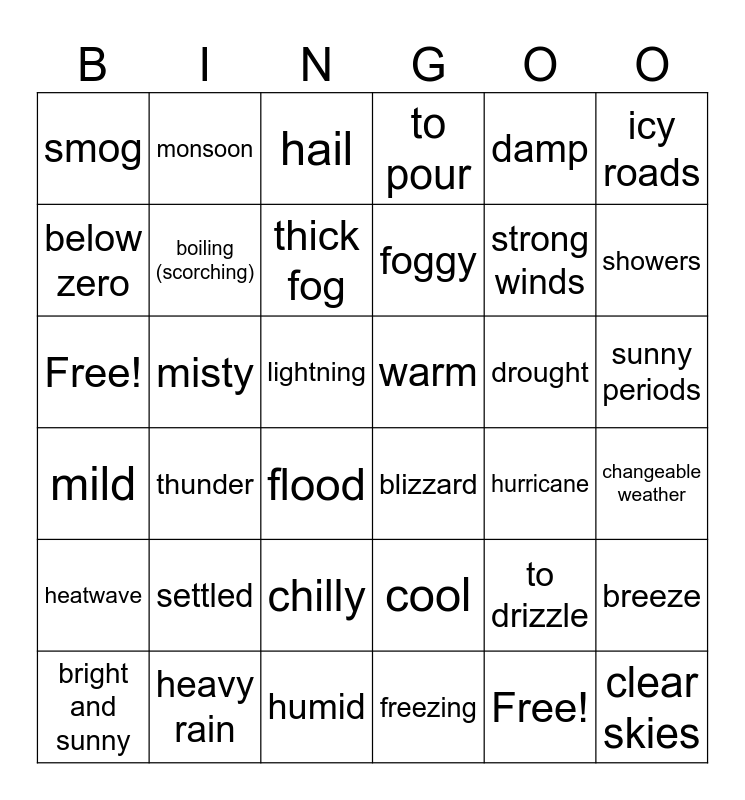 This bingo card has 36 words: cool, chilly, freezing, below zero, mild, warm, boiling (scorching), humid, damp, to drizzle, showers, to pour, breeze, misty, foggy, smog, heatwave, drought, Free!, hail, lightning, thunder, blizzard, flood, hurricane, monsoon, strong winds, heavy rain, thick fog, icy roads, clear skies, bright and sunny, changeable weather, sunny periods, settled and Free!.