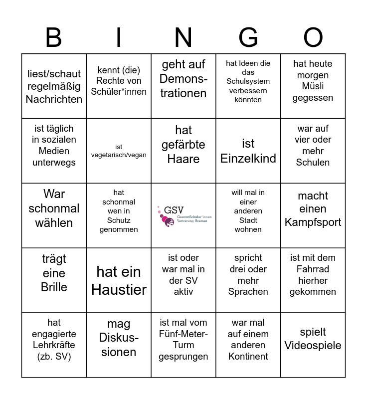 This bingo card has a free space and 24 words: hat ein Haustier, mag Diskus-sionen, hat gefärbte Haare, hat engagierte Lehrkräfte (zb. SV), hat heute morgen Müsli gegessen, liest/schaut regelmäßig Nachrichten, ist täglich in sozialen Medien unterwegs, kennt (die) Rechte von Schüler*innen, will mal in einer anderen Stadt wohnen, ist oder war mal in der SV aktiv, ist Einzelkind, War schonmal wählen, spricht drei oder mehr Sprachen, ist mit dem Fahrrad hierher gekommen, ist vegetarisch/vegan, war mal auf einem anderen Kontinent, macht einen Kampfsport, geht auf Demons-trationen, war auf vier oder mehr Schulen, hat schonmal wen in Schutz genommen, spielt Videospiele, trägt eine Brille, hat Ideen die das Schulsystem verbessern könnten and ist mal vom Fünf-Meter- Turm gesprungen.