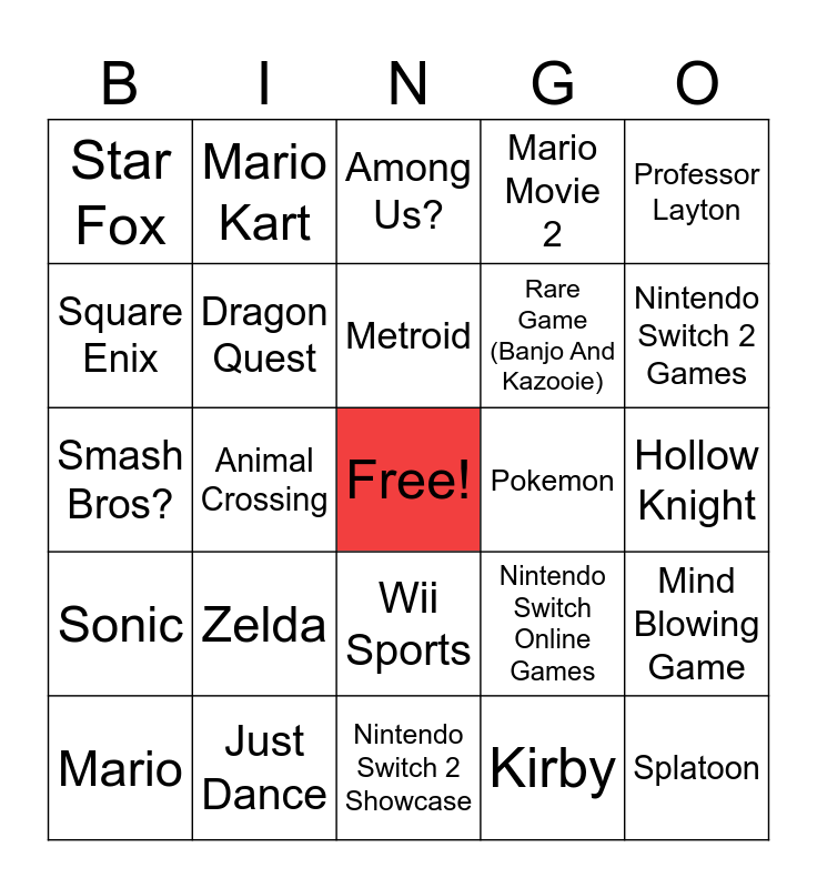 This bingo card has a free space and 24 words: Mario, Zelda, Metroid, Kirby, Professor Layton, Star Fox, Mario Kart, Among Us?, Pokemon, Hollow Knight, Smash Bros?, Dragon Quest, Nintendo Switch Online Games, Mind Blowing Game, Square Enix, Just Dance, Nintendo Switch 2 Showcase, Mario Movie 2, Nintendo Switch 2 Games, Sonic, Animal Crossing, Wii Sports, Rare Game (Banjo And Kazooie) and Splatoon.