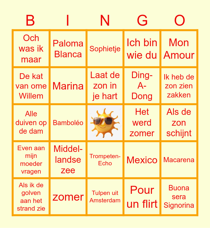 This bingo card has a free space and 29 words: Als ik de golven aan het strand zie, Het was aan de Costa del sol, Bamboléo, Daar bij de waterkant, Och was ik maar, Sophietje, Marina, Middel- landse zee, Het werd zomer, zomer, Als de zon schijnt, Buona sera Signorina, Tulpen uit Amsterdam, Pour un flirt, Ik heb de zon zien zakken, Zoek de zon op, Trompeten- Echo, Even aan mijn moeder vragen, Mon Amour, Alle duiven op de dam, Mexico, De Wandelclub, Ding- A- Dong, De kat van ome Willem, Ich bin wie du, Paloma Blanca, Macarena, Laat de zon in je hart and Waling on sunshine.