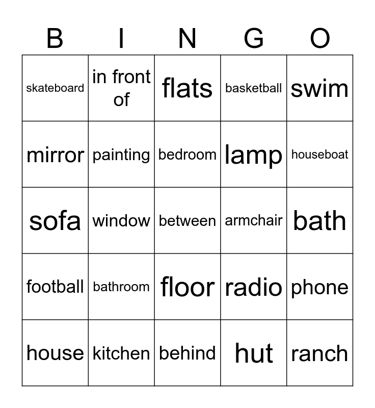 This bingo card has a free space and 24 words: bathroom, kitchen, bedroom, house, swim, skateboard, mirror, in front of, armchair, floor, lamp, sofa, radio, phone, painting, hut, bath, flats, houseboat, window, ranch, football, basketball and behind.