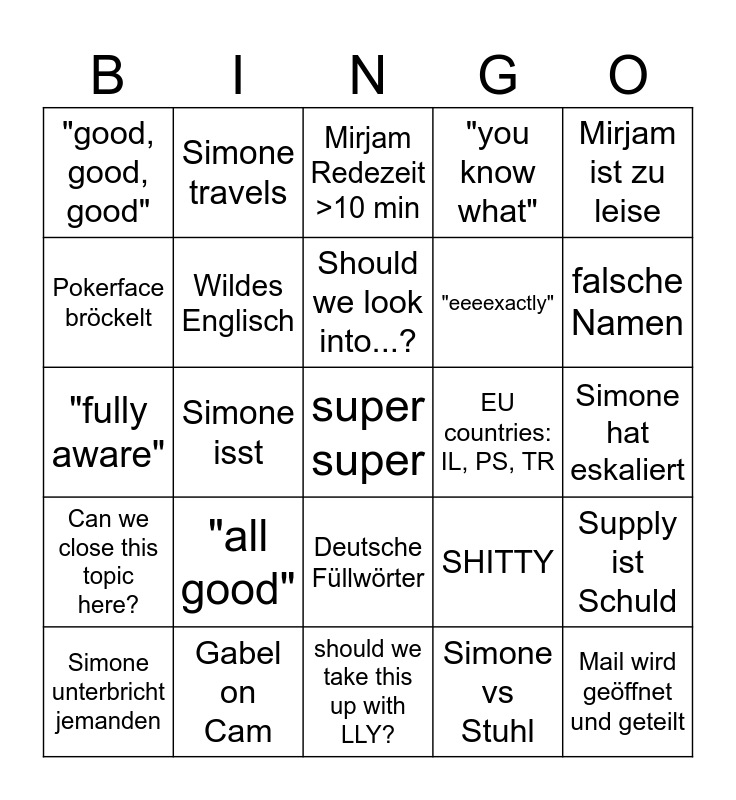 This bingo card has 25 words: "all good", should we take this up with LLY?, Should we look into...?, Simone unterbricht jemanden, Mirjam ist zu leise, "good, good, good", Pokerface bröckelt, Simone travels, EU countries: IL, PS, TR, Deutsche Füllwörter, "eeeexactly", "fully aware", SHITTY, Supply ist Schuld, Wildes Englisch, Mail wird geöffnet und geteilt, Simone hat eskaliert, Mirjam Redezeit >10 min, falsche Namen, Simone isst, super super, Gabel on Cam, Can we close this topic here?, "you know what" and Simone vs Stuhl.