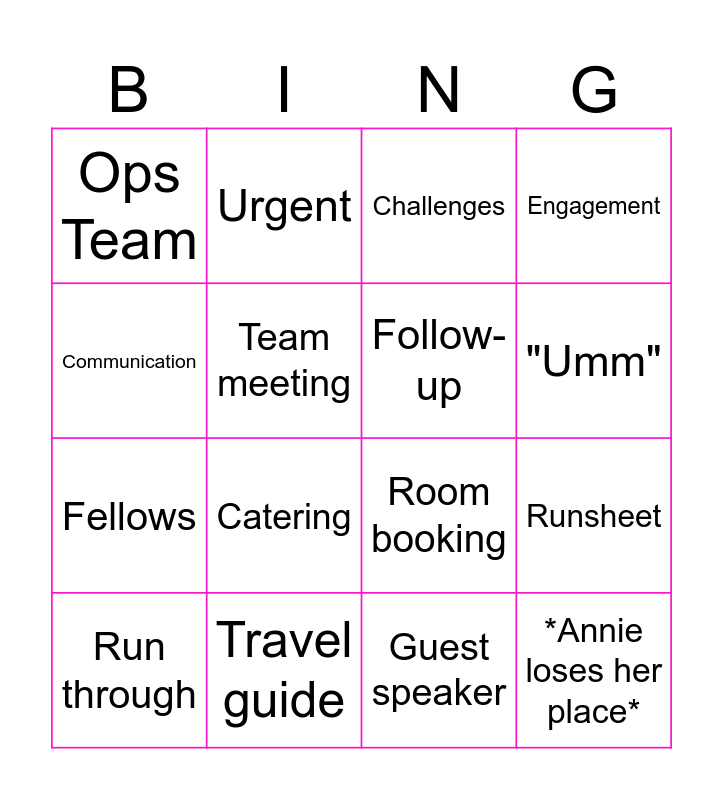 This bingo card has 24 words: Logistics, Module, "Umm", Venue, Communication, Ops Team, Team meeting, Urgent, Travel guide, "Annie" - Manager's accent, Fellows, Room booking, Agenda, Check-in, Follow-up, *Annie faces a technical difficulty*, Guest speaker, Challenges, Catering, Runsheet, Run through, *Annie loses her place*, Engagement and Schedule.