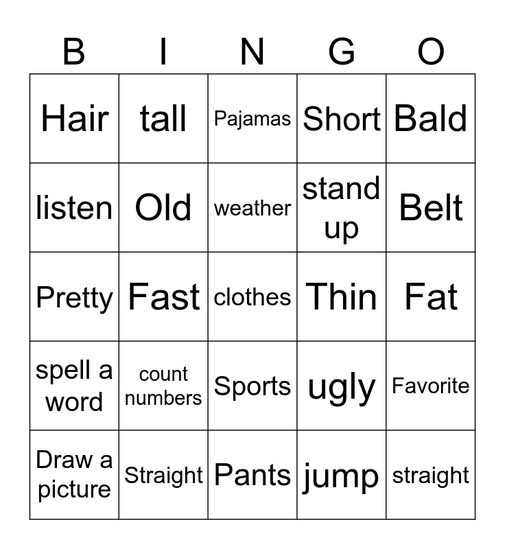 This bingo card has 40 words: Clothes, Pretty, Twelve, Old, Straight, Sports, weather, Hobbies, Bald, spell a word, Fast, Short, clothes, Fat, Thin, count numbers, Young, Hair, Beautiful, Pajamas, Favorite, jump, stand up, listen, Write, can, Dance, twenty, straight, read, Watch tv, Draw a picture, curly, ugly, Belt, Pants, Socks, Dress, tall and Scarf.