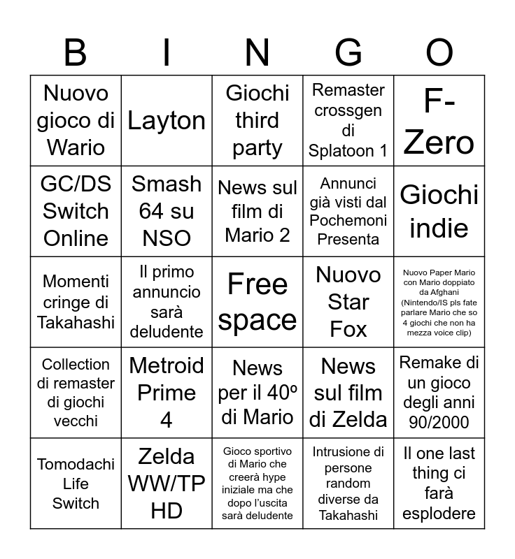 This bingo card has a free space and 24 words: Metroid Prime 4, Zelda WW/TP HD, News sul film di Mario 2, Tomodachi Life Switch, F-Zero, Nuovo gioco di Wario, GC/DS Switch Online, Layton, Nuovo Star Fox, News per il 40º di Mario, Annunci già visti dal Pochemoni Presenta, Momenti cringe di Takahashi, News sul film di Zelda, Remake di un gioco degli anni 90/2000, Smash 64 su NSO, Intrusione di persone random diverse da Takahashi, Nuovo Paper Mario con Mario doppiato da Afghani (Nintendo/IS pls fate parlare Mario che so 4 giochi che non ha mezza voice clip), Giochi third party, Giochi indie, Il primo annuncio sarà deludente, Il one last thing ci farà esplodere, Collection di remaster di giochi vecchi, Remaster crossgen di Splatoon 1 and Gioco sportivo di Mario che creerà hype iniziale ma che dopo l’uscita sarà deludente.
