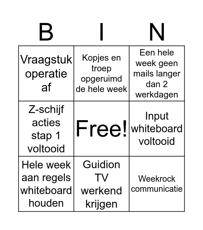 This bingo card has a free space and 8 words: Input whiteboard voltooid, Een hele week geen mails langer dan 2 werkdagen, Kopjes en troep opgeruimd de hele week, Hele week aan regels whiteboard houden, Vraagstuk operatie af, Weekrock communicatie, Z-schijf acties stap 1 voltooid and Guidion TV werkend krijgen.